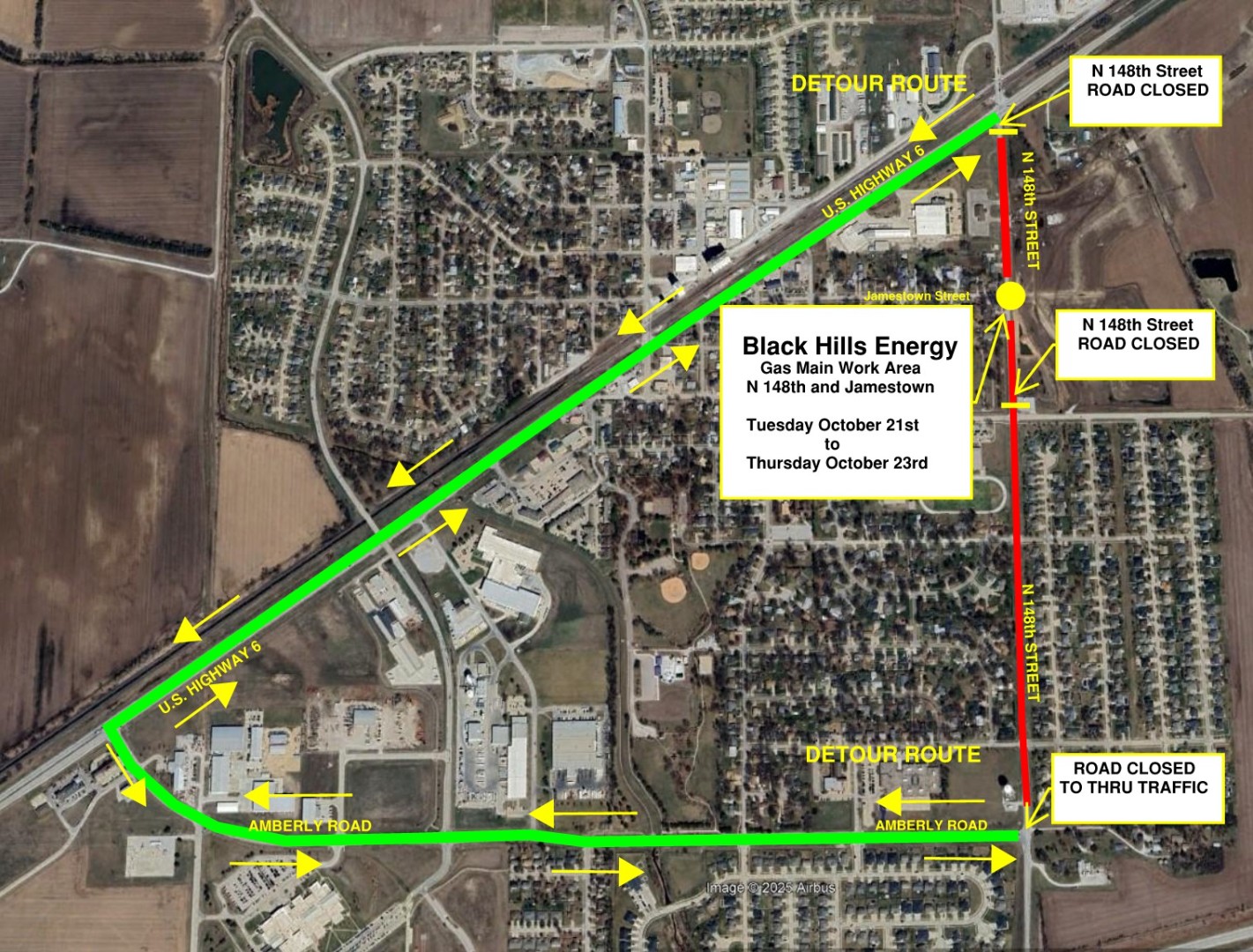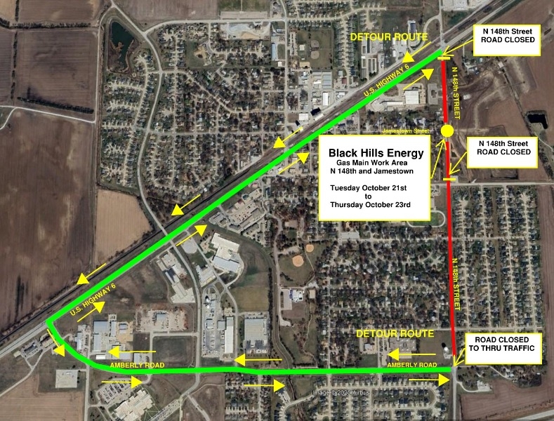 N 148th St will be CLOSED from Heywood to Hwy 6 beginning TUESDAY OCT 21st thru THURSDAY OCT 23rd for natural gas installation in the area. The detour route will be Amberly Rd. Please plan accordingly.