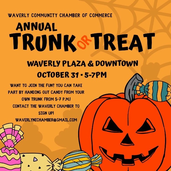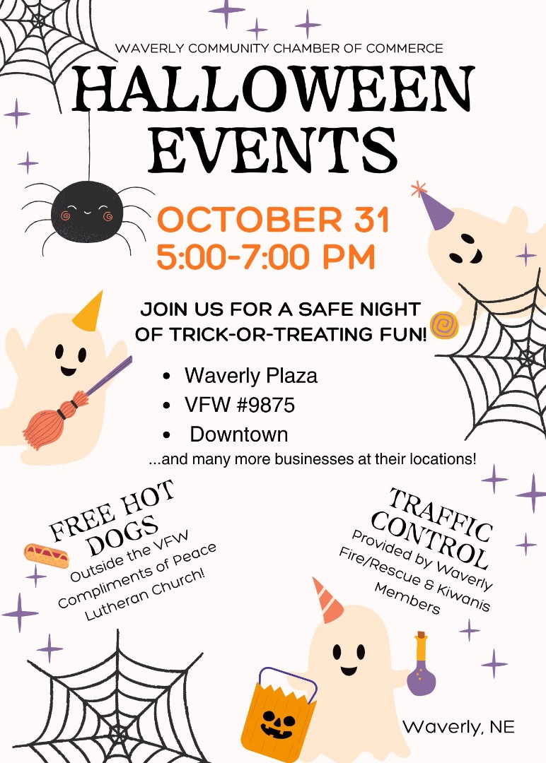 Each year, the Waverly Community Chamber of Commerce hosts safe trick-or-treating on Halloween, October 31, from 5-7pm at both the Waverly Downtown and the Waverly Plaza locations. Many Chamber Members and other local businesses hand out candy inside the VFW Hall 13820 Guildford St, along the Plaza area, Horizon Bank, and the Downtown area! Don't forget to stop by Tomorrow's Veterinary, Terry's Body Shop, Cubby's, and Waverly Fire/Rescue! There are also free hot dogs and waters available for everyone just outside of the VFW Hall, compliments of Peace Lutheran Church. Waverly Fire/Rescue and Kiwanis members assist in traffic safety at 141st and Hwy 6 and 141st and Kenilworth Streets.